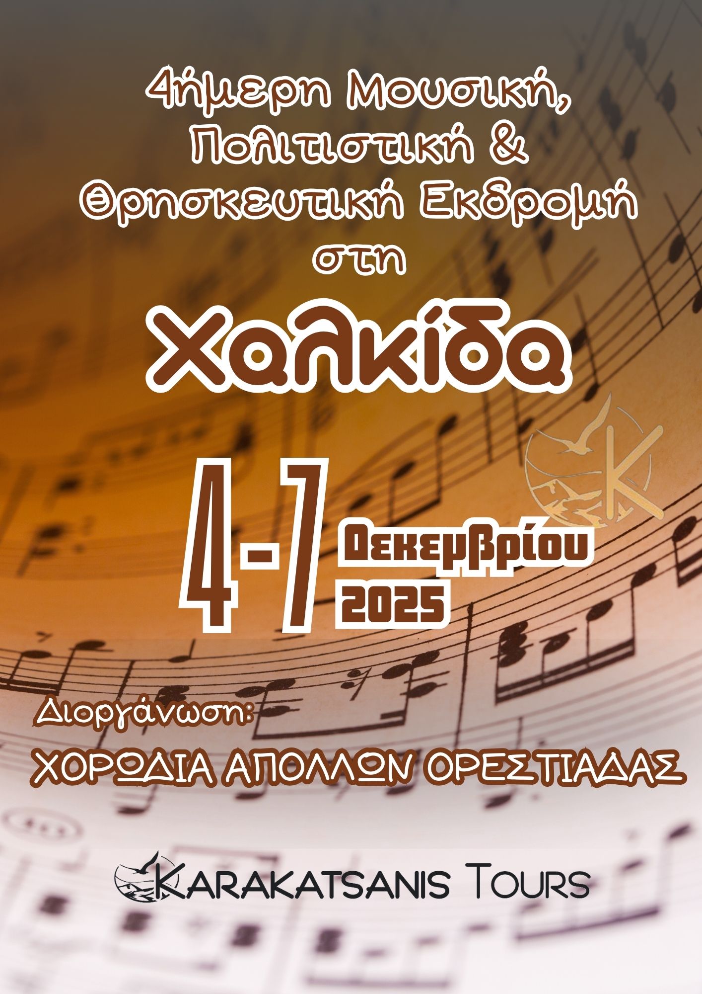Με αφορμή τη συμμετοχή της Χορωδίας «Απόλλων» Ορεστιάδας στο Διεθνές Χορωδιακό Φεστιβάλ της Χαλκίδας, σας προσκαλούμε σε μια 4ήμερη εκδρομή στη Χαλκίδα που συνδυάζει μουσική, πολιτισμό, θρησκευτική κατάνυξη και εξερεύνηση της Εύβοιας!